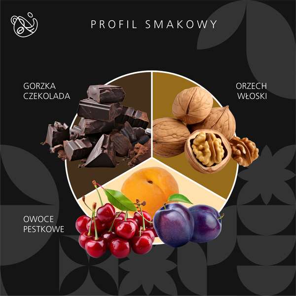 Profil smakowy: Delikatny, zrównoważony smak, wyrazista crema. Subtelne body, idealny balans pomiędzy nutami owocowymi, a słodyczą czekolady.