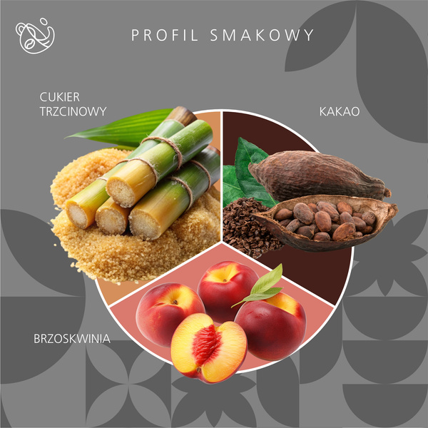 wyczuwalna słodycz cukru trzcinowego z nutami karmelu, kakao i gorzkiej czekolady, delikatny posmak brzoskwiniowy.